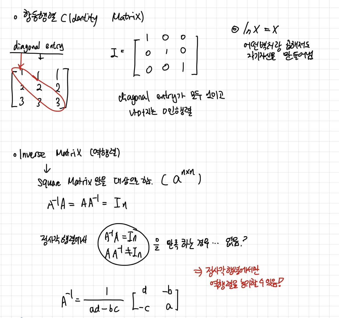 - 항등행렬 : Diagonal Entry 가 모두 1이고 나머지는 0인 행렬을 말한다. (어떤 벡터와 곱해도 자기 자신을 만들어 냄)