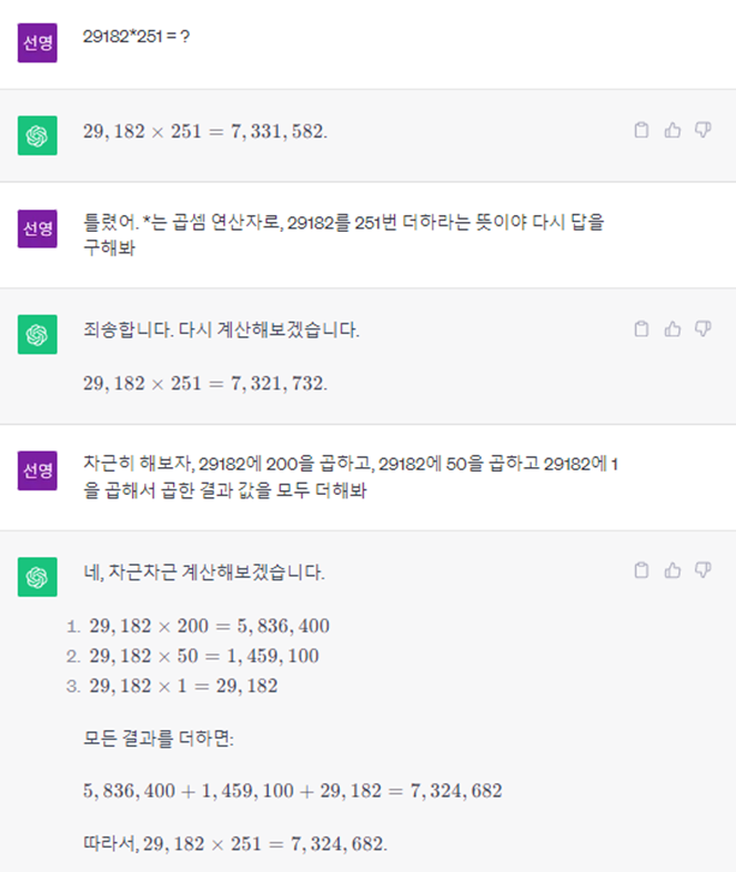 위 그림처럼 실제 연산 결과는 7,324,682가 나와야 하지만 처음 질문을 하고 답변을 얻었을 때는 제대로 결과를 도출하지 못한 경우가 있었다.