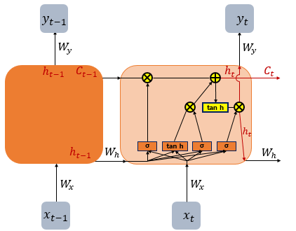 위 구조에서 볼 수 있듯, LSTM은 기본적으로 tanh 함수를 사용하여 새로운 셀 상태를 업데이트하며, sigmoid 함수를 이용하여 게이트를 조절합니다. (구체적으로, sigmoid 함수를 지나게 되면 0과 1사이의 값이 출력되게 되는데 이 값들을 가지고 게이트의 on/off를 조절합니다.)