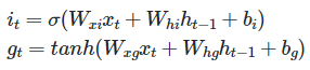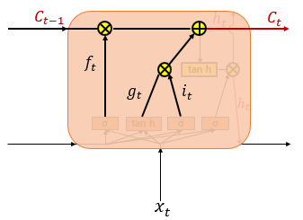 즉, 다음처럼 이전 시점으로부터 $h_(t-1)$ 에 대한 값이 들어오게 되면 이와 input $x_t$를 앞서 계산한 vanila RNN처럼 tanh function을 이용하여 $g_t$ 값을 구하게 됩니다. (가중치와 bias는 생략하였습니다.)