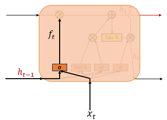 forget gate는 기억을 삭제하기 위한 게이트입니다. 앞서 말했듯, vanila RNN의 경우 장기 의존성에 취약하다는 단점이 있었죠. 따라서 피필요 없는 데이터에 관한 기억은 삭제해 주는 것 입니다. forget gate를 수식으로 나타내면 아래와 같으며, sigmoid 함수를 거친 결과, 0에 가까울수록 정보가 많이 삭제된 것을 의미하고, 1에 가까울수록 정보를 온전히 기억하는 것을 의미합니다.