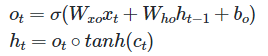 Output gate는 현재 시점의 $x_t$ 값과 이전 시점 $t-1$ 의 hidden state가 sigmoid함수를 거쳐 나온 결과값입니다. output gate는 현재 시점 t의 hidden state를 결정하는데 역할을 하게 됩니다.