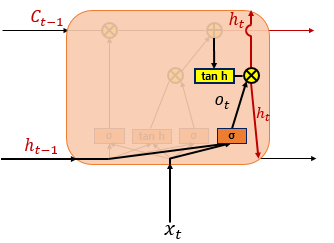 앞서 구한 Cell state의 현재시점 $C_t$ 가 tanh 함수를 거치며 -1 ~ 1 사이의 결과를 출력하고 이것이 output gate 의 값과 연산되면서 새로운 hidden state가 되기도 하고 바로 output state로 향하기도 합니다.