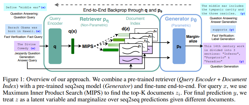 T5, BART, RAG와 같은 모델들은 seq2seq task에 의해 파인튜닝 될 수 있으며 Retriever와 Generator는 함께 공동으로 학습된다.