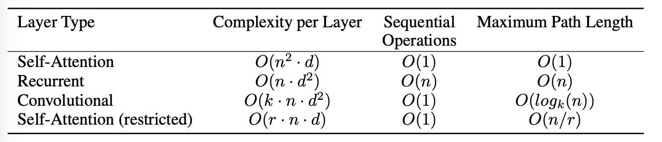 $n$ 은 sequence의 길이를, $d$는 차원을, $k$는 convolution 의 kernel size를 의미합니다. $r$은 self-attention을 수핼할 때, 몇몇 이웃까지 포함할 것인지를 의미합니다.