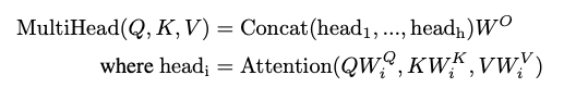 여기서 ${W_i}^Q, {W_i}^K, {W_i}^V$ 는 각 head 에 대한 선형 변환을 위한 가중치 행렬을 의미하고 $W^O$ 는 최종 출력을 위한 가중치 행렬을 의미합니다.
