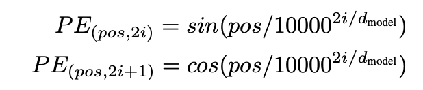각 위치 (pos)에 대하여 차원 i의 위치 인코딩은 위의 식을 통해 계산할 수 있습니다. sine, cosine 함수의 주기적인 패턴을 갖는 특성 때문에, 모델의 상대적인 위치 정보를 Encoding 하고 활용할 수 있습니다.