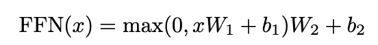 Feed-forward Network는 2개의 linear transform과 ReLU 함수로 이루어져 있습니다.