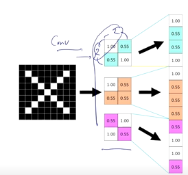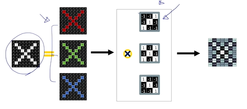 예를 들어, 위의 그림처럼 왼쪽의 9*9 형태의 filter가 존재한다고 할 때, 이 이미지는 원본 이미지를 훑어가면서 해당 패턴이 그 특정 부분에 존재하는지를 연산합니다. 패치의 값과 이미지에서 같은 위치에 존재하는 픽셀값을 서로 곱함으로써 각 픽셀별로 패치와 매칭이 됐는지, 안됐는지를 두 픽셀간의 곱셈으로 나타내는 것이죠. 또 이 곱셈들을 모두 합하고 해당 필터의 크기 (패치의 크기)를 나누면 패치와 매칭되는 정도를 정량적으로 나타낼 수 있습니다.