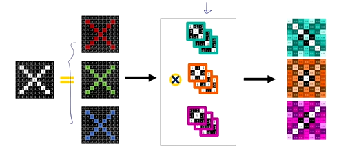 컬러 이미지의 특성상, RGB Channel 의 3개 채널 이미지가 존재한다고 가정할 때, 다음과 같이 3 Channel Activation map 을 그려보는 과정도 생각할 수 있습니다. 입력 채널 각각에 들어가게 될 이미지 패치들이 하나의 Convolution filter를 이루는 것이죠.