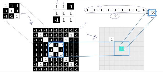 예를 들어, 위의 그림처럼 왼쪽의 9*9 형태의 filter가 존재한다고 할 때, 이 이미지는 원본 이미지를 훑어가면서 해당 패턴이 그 특정 부분에 존재하는지를 연산합니다. 패치의 값과 이미지에서 같은 위치에 존재하는 픽셀값을 서로 곱함으로써 각 픽셀별로 패치와 매칭이 됐는지, 안됐는지를 두 픽셀간의 곱셈으로 나타내는 것이죠. 또 이 곱셈들을 모두 합하고 해당 필터의 크기 (패치의 크기)를 나누면 패치와 매칭되는 정도를 정량적으로 나타낼 수 있습니다.