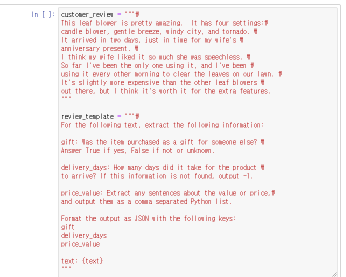 그리고 다음과 같이 고객 리뷰와 함께 JSON 형태의 출력을 얻기 위한 프롬프트 템플릿을 제공해준다. 위의 템플릿을 앞서말한 Prompt template를 통해 생성하여 출력해 보면 결과물이 json형태의 key-value쌍을 가진 것처럼 출력된다. (Output parsing을 이용하여 출력 형태를 지정해 준 결과!)