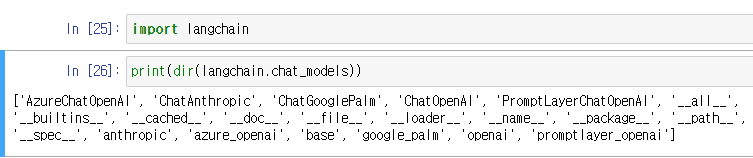 LangChain에서 지원하는 LLM 모델은 다양한 모델들이 있는데, 다음과 같이 dir함수를 이용해 지원하는 모델들을 확인해 본 결과