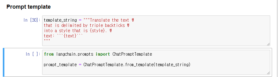 다음과 같이 Langchain module에서 ChatPrompt Template 모듈을 import 하고, 프롬프트를 입력해주면 Prompt template 모듈로 예시 프롬프트로부터 기본 프롬프트 템플릿을 생성하고, 그 안에서 원래의 프롬프트를 추출할 수도 있고 프롬프트에 어떤 입력 변수들이 있는지도 확인할 수 있다.