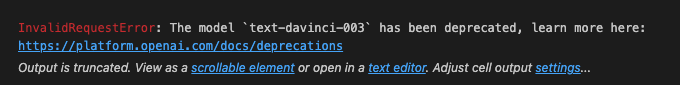 더 이상 open AI 에서 text-davinci-003 모델을 지원하지 않는 것 같습니다.