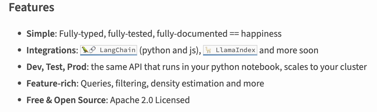 pypi 에 나와있는 모듈 특징을 보더라도 LangChain, LlamaIndex를 위주로 하는 데이터베이스 모델임을 확인할 수 있습니다.