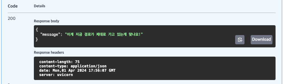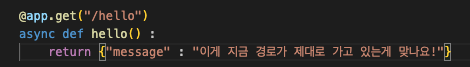 저도 다음과 같이 FastAPI 를 이용해 원하는 메세지를 출력하는 실습을 해 보았는데요
