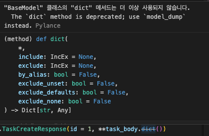 Pydantic 에서 더 이상 BaseModel 에서 dict 메서드를 지원하지 않기 때문에