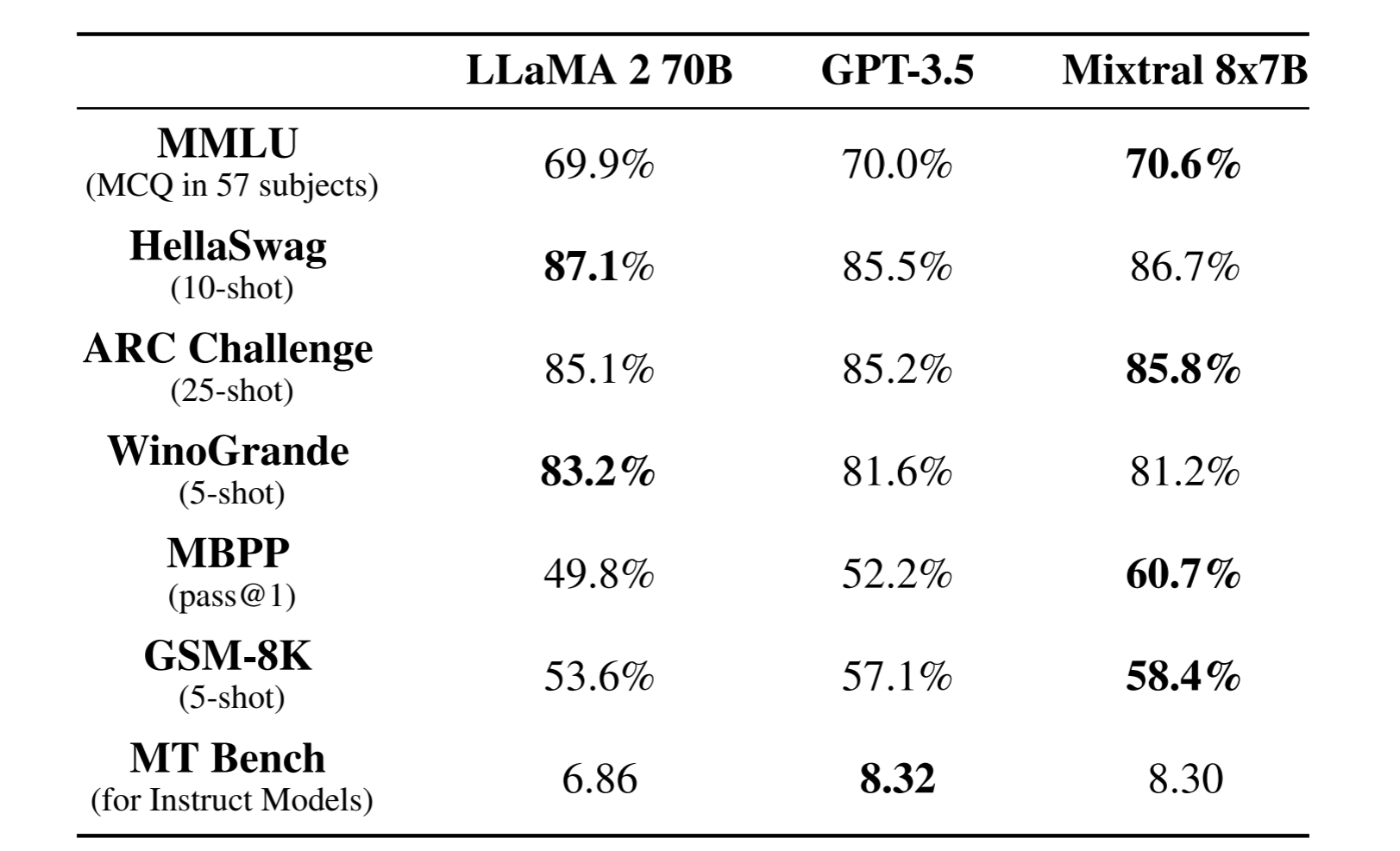 Mixtral of Expert모델은 32K 토큰으로 이루어진 Context size로 구성되어 있으며, 이 모델은 llama2 70B 모델, 그리고 GPT-3.5 모델 대비 모든 벤치마크 성능을 능가했다고 쓰여있습니다. 특히 llama2 70B 모델 대비 Mathematics, Code Generation, Multilingual 벤치마크에서 뛰어난 성능을 보였다고 합니다.