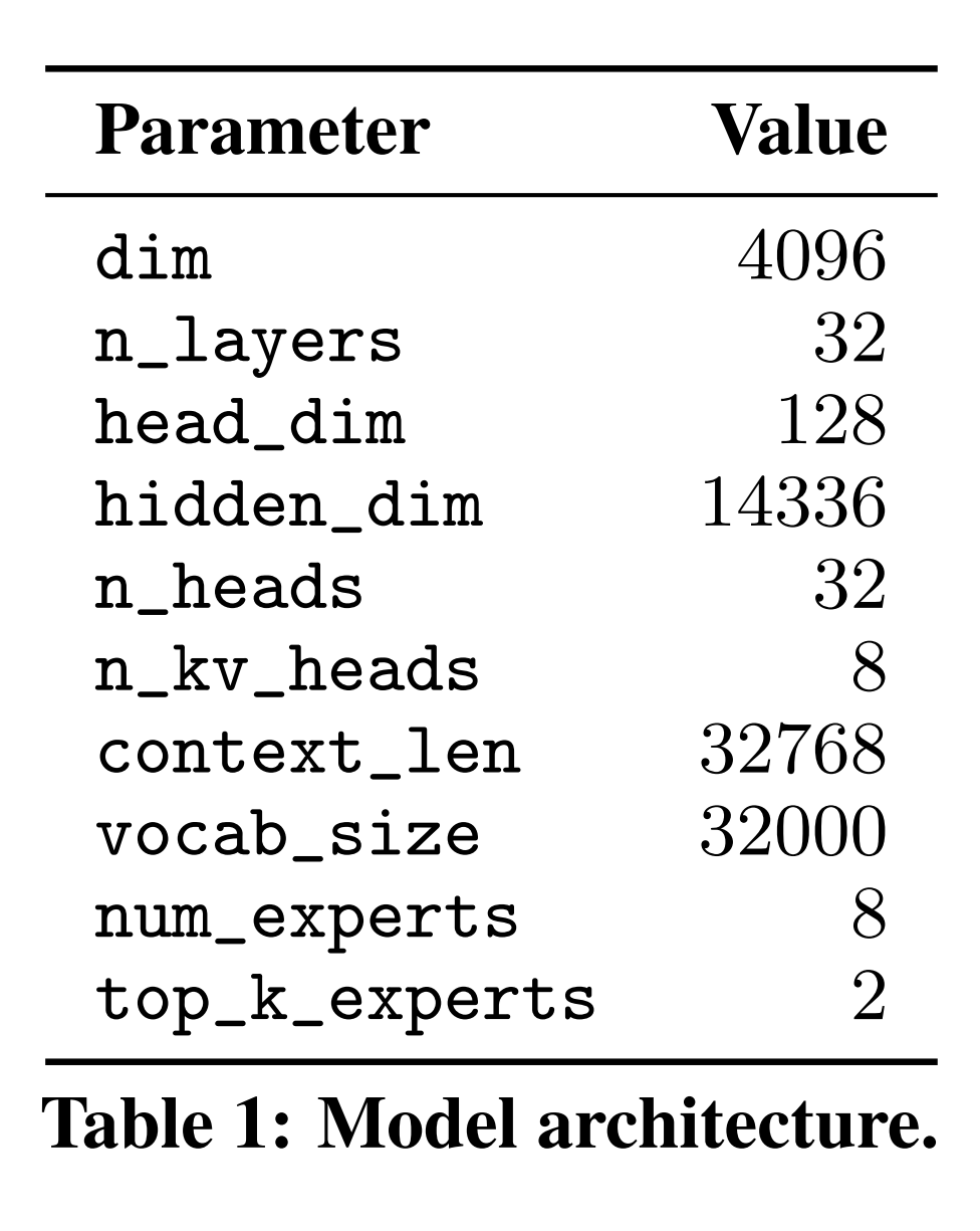 Mistral 모델 8개를 각각의 Expert로 이용하였기 때문에 Mistral 7B 모델과 같은 architecture로 구성되어 있습니다. (하지만 각 FFN은 각 expert를 의미하며 다르게 구성된 8개의 FFN block이 존재하게 됩니다.)