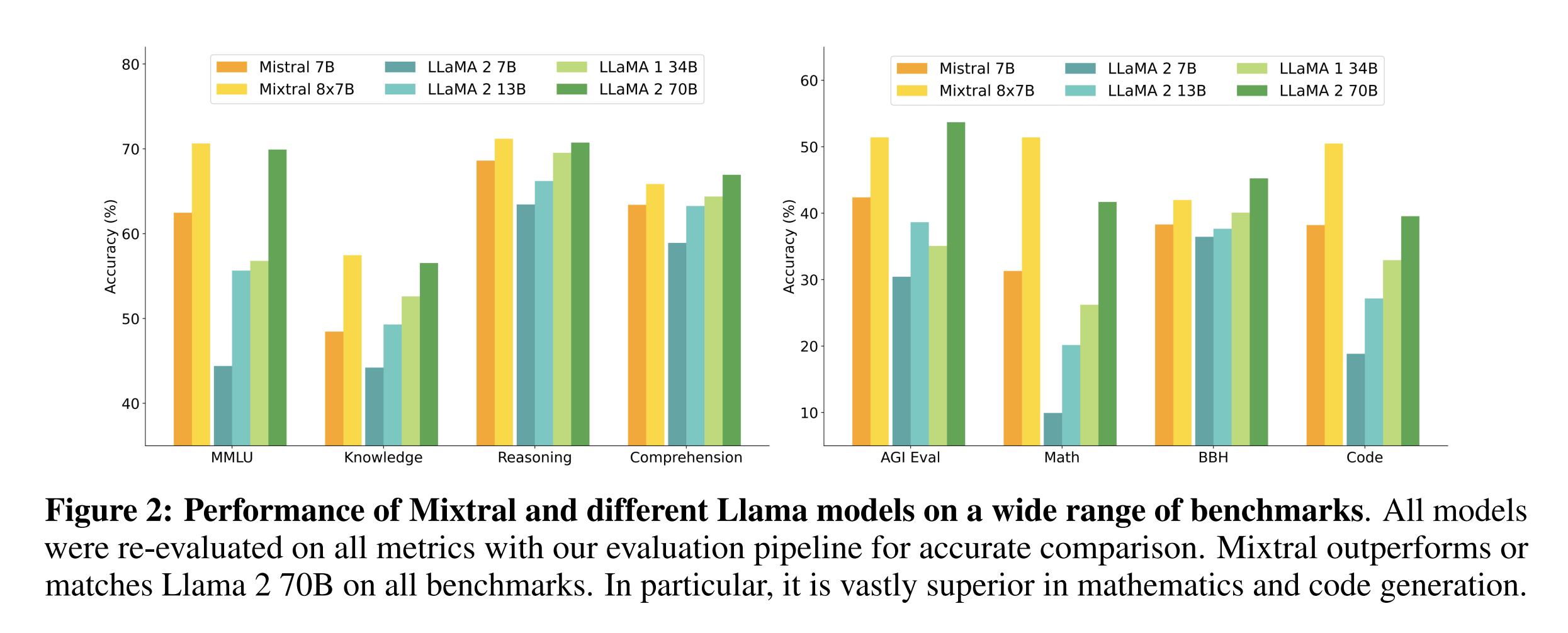 Mixtral 모델의 성능 비교를 보면, 다음과 같이 주로 Llama 2 70B 짜리 모델과 비교를 하였습니다.
