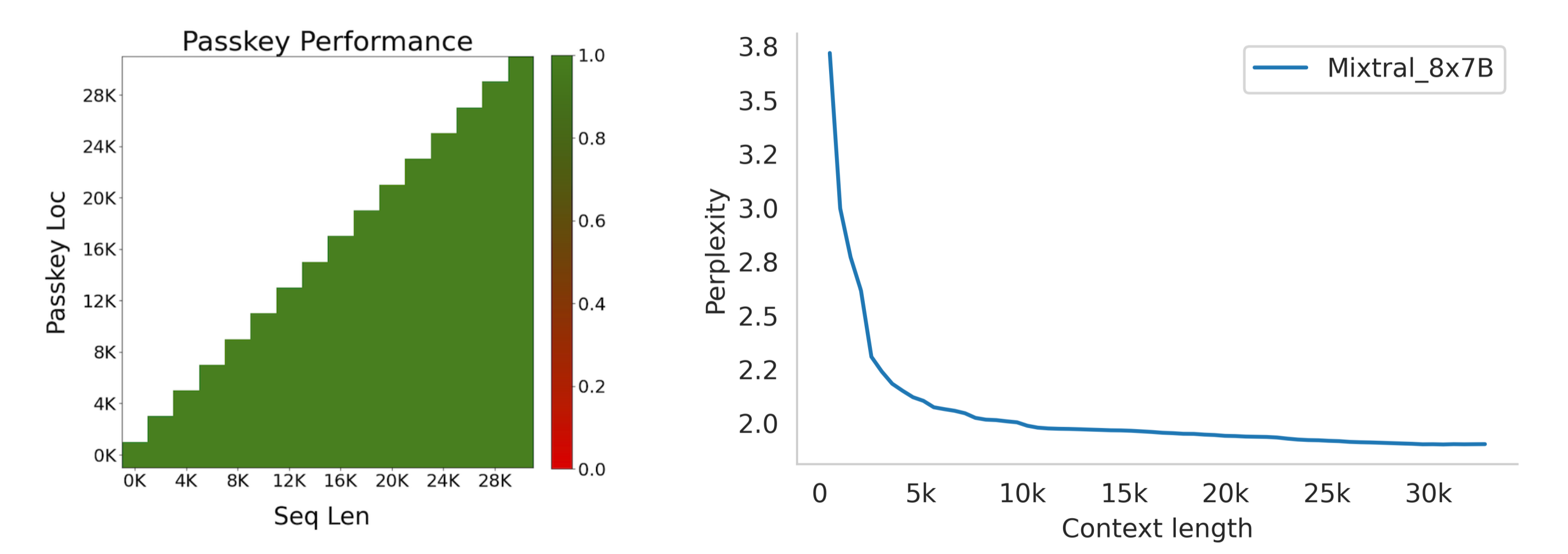 본 연구에서는, Mixtral model의 문맥처리 기능을 평가하기 위해 passkey retrieval 태스크 평가도 진행하였는데, (긴 프롬프트에 무작위로 삽입된 패스키를 검색하는 능력을 측정하는 태스크) 위 그림과 같이 context의 길이나 passkey의 위치 정보 없이 100%의 검색정확도로 판별해낸 것을 확인할 수 있습니다.