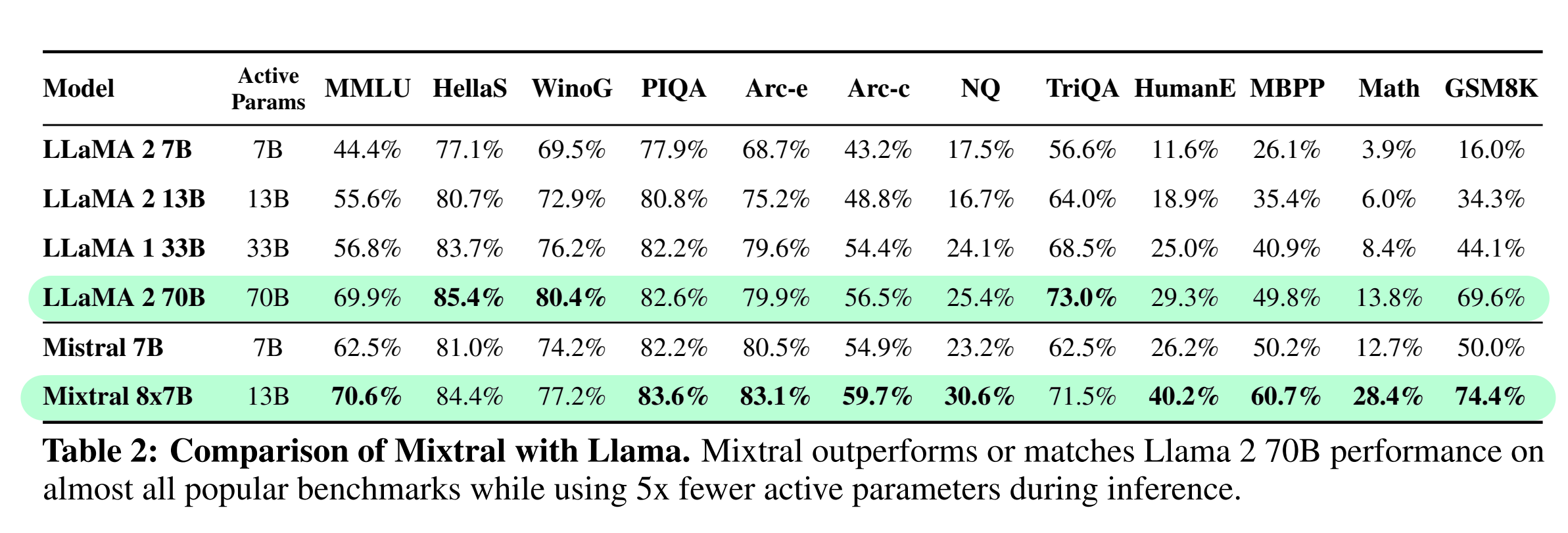 Llama2 모델이 70B 파라미터를 갖는대비 Mixtral의 경우 Memory cost에서 총 47B 파라미터, Active Parameter의 경우는 13B이기 때문에 훨씬 적은 파라미터 사이즈 대비 큰 효율성을 갖는 것이죠.