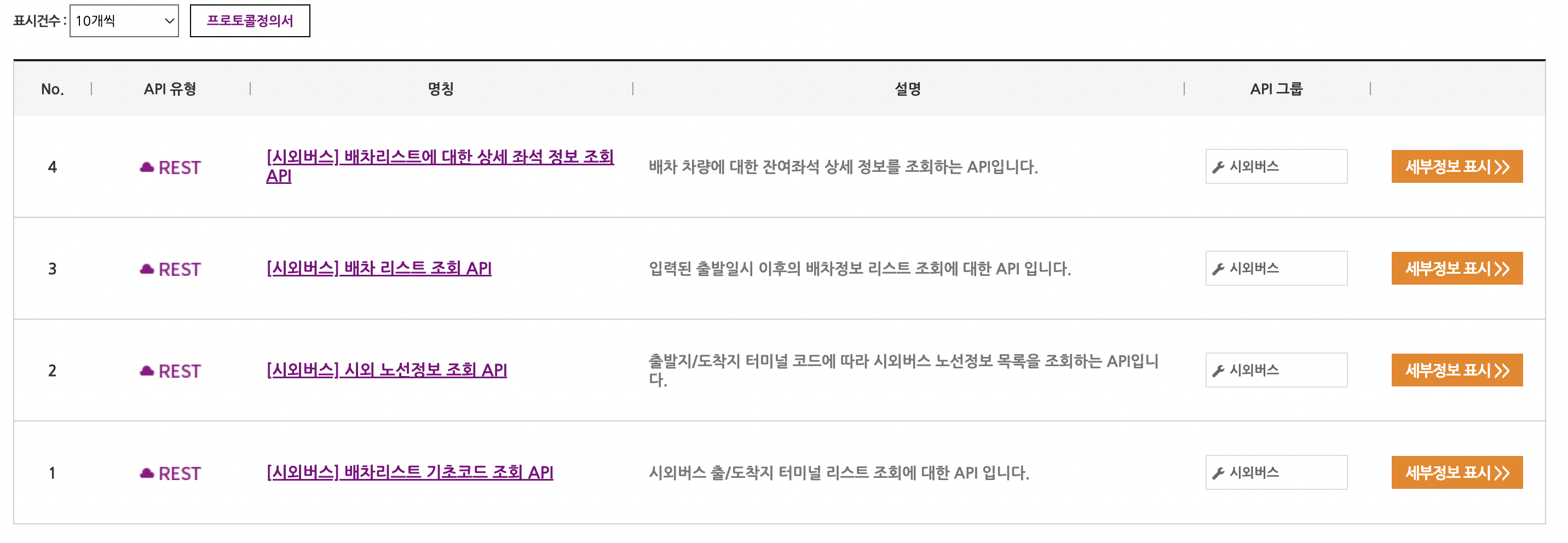 출도착지에 대한 터미널 리스트나 노선 정보 조회 등은 있었지만,