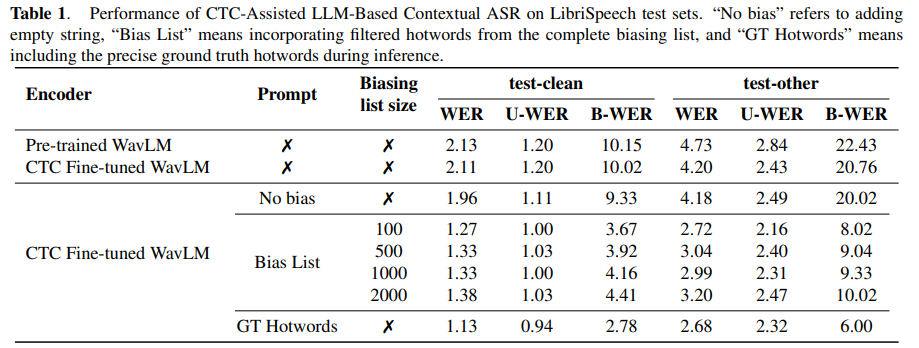 Bias list를 생성하여 Prompt에 입력한 것이 성능이 더 좋은 것을 확인할 수 있습니다. 다만 Biasing list size를 너무 키우게 될 경우 오히려 성능이 감소하는 모습을 보이네요.