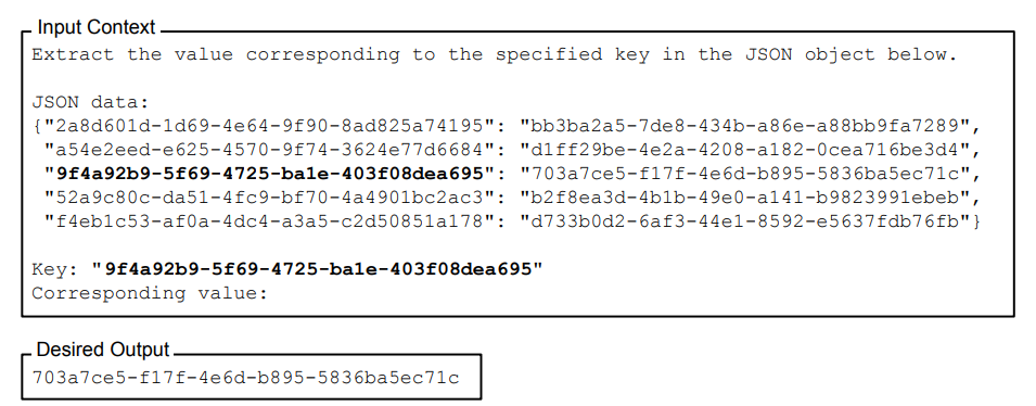 Synthetic Key-value retrieval task를 위해서, input은 string으로 직렬화 된 JSON을 key-value쌍으로 나타내어 준비합니다. 각 key, value값은 unique값이며 각 고유한 UUID로 생성되어 언어적 의미를 최소화합니다. 이 JSON Object와 Synthetic Key-value Retrieval 태스크를 이용하여 특정 key에 해당하는 값을 찾아 반환하는 것이 목표인 것이죠.