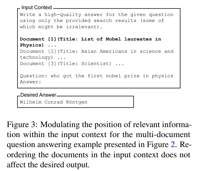 multi-document question answering 태스크를 진행하기 위해서는 모델이 input context내에서 관련 정보를 얼마나 잘 찾아낼 수 있는지가 중요한 쟁점이 되겠죠.