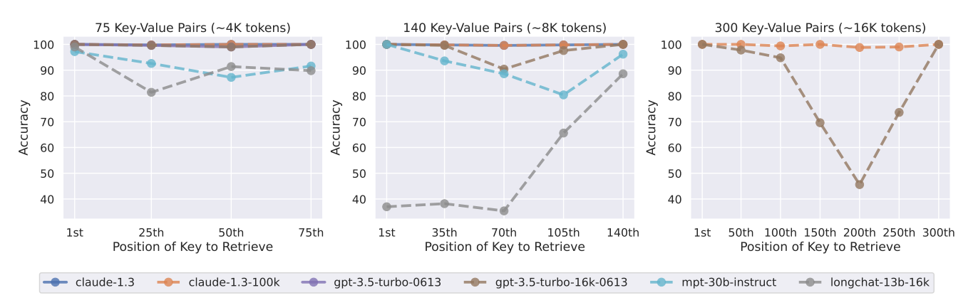 모델에게 정수 key-value쌍 (json)을 제공해서 언어모델의 실제 검색기능이 잘 동작하는지 확인하는 것이죠. 이 실험을 통해 특정 모델들에서는 key-value쌍을 명확히 검색해내는 것을 확인할 수 있었고 일부 특정 모델에서는 위의 U-shape 커브 처럼 Lost in the middle 현상이 발생하는 것을 확인할 수 있었습니다.