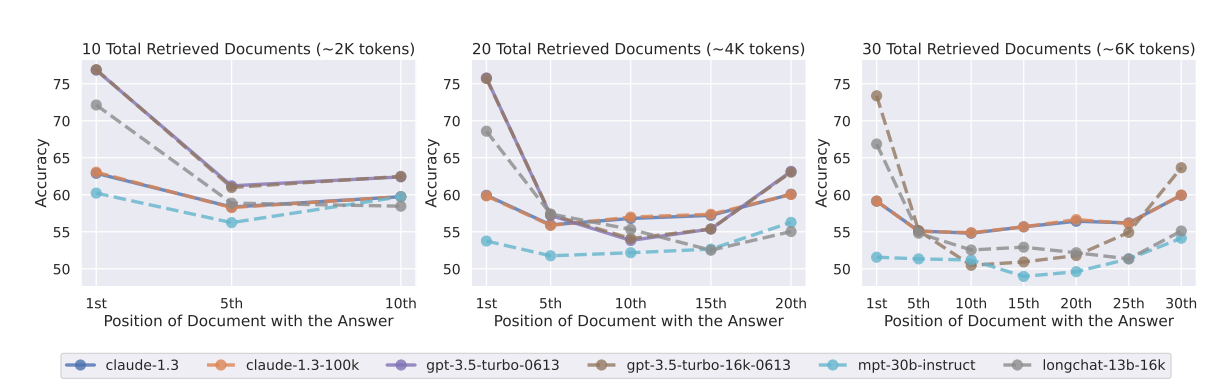 - 긴 input context 안에서 답변에 관련한 정보를 어느 위치에 두느냐에 따라 성능이 상당히 저하되는 것을 확인